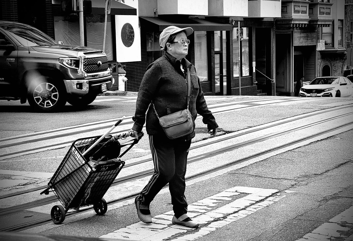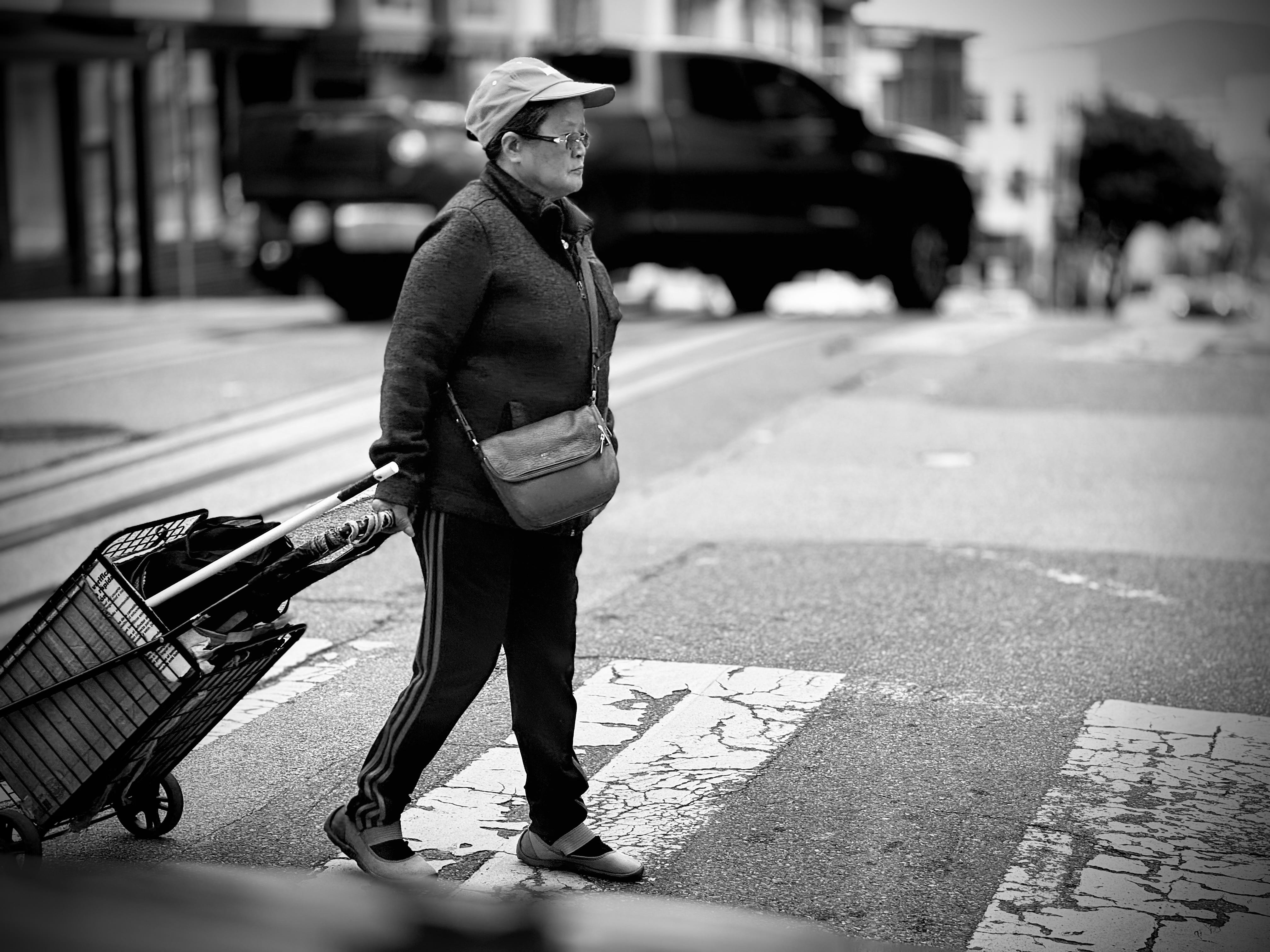 I noticed a woman wearing a sweater and cap, lugging a small cart behind her. As she crossed the street, I captured the moment. It was immediate and instinctual.
