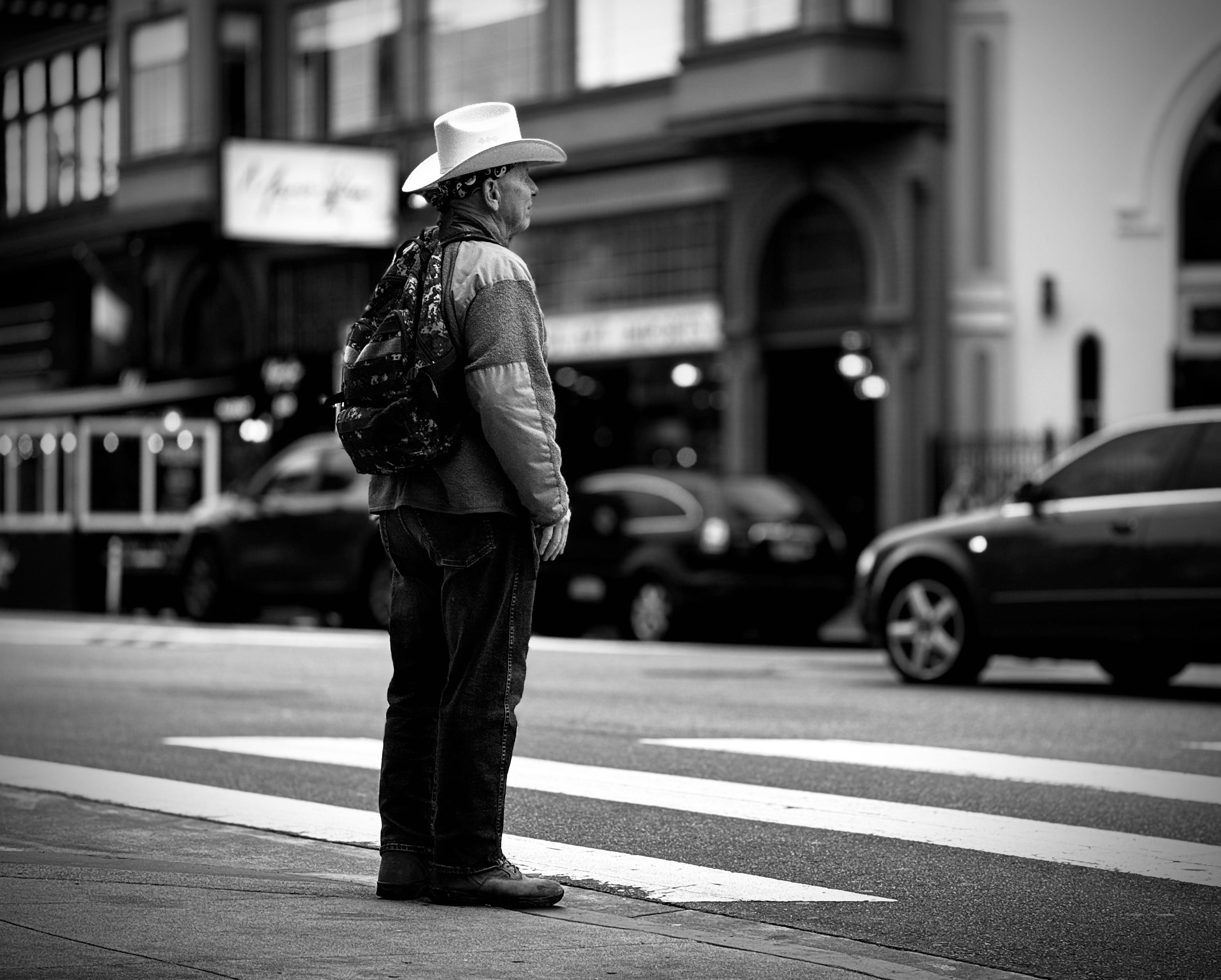 I don’t know if he was a real cowboy or simply dressed like one. But something about his hat and jacket, set against concrete and glass and urban modernity, struck me.
