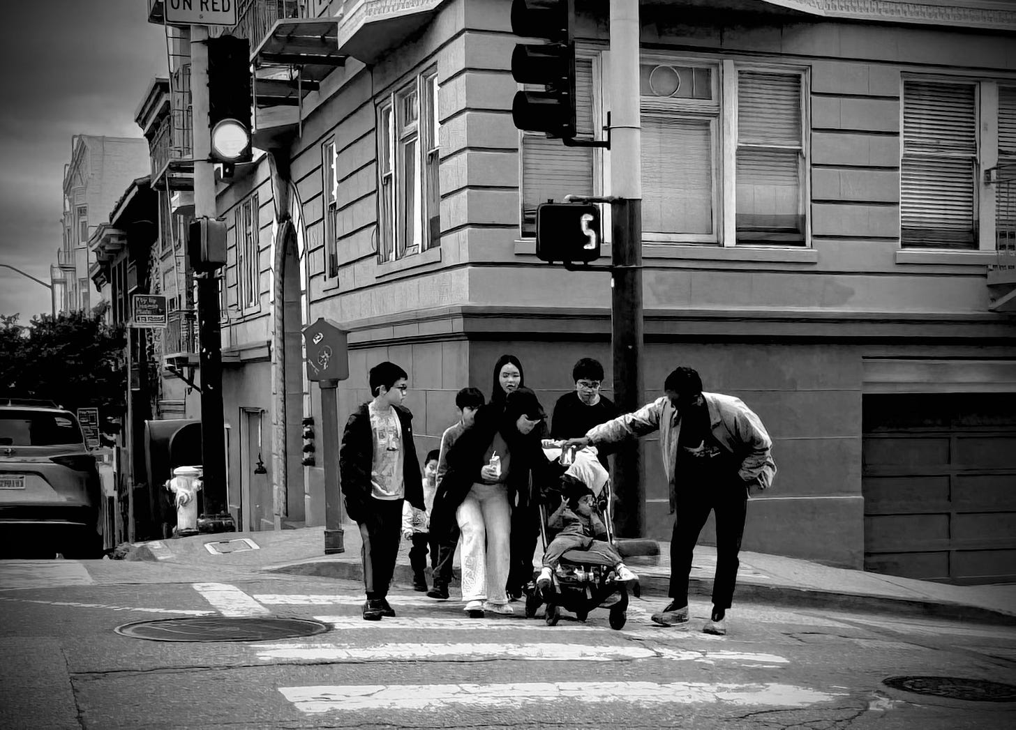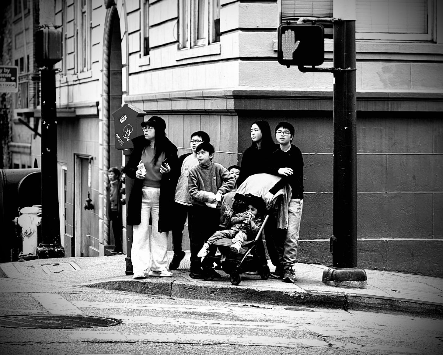 Near the end of my San Francisco trip, I watched a family preparing to cross a busy street. The group included adults, adolescents, children, and a toddler.