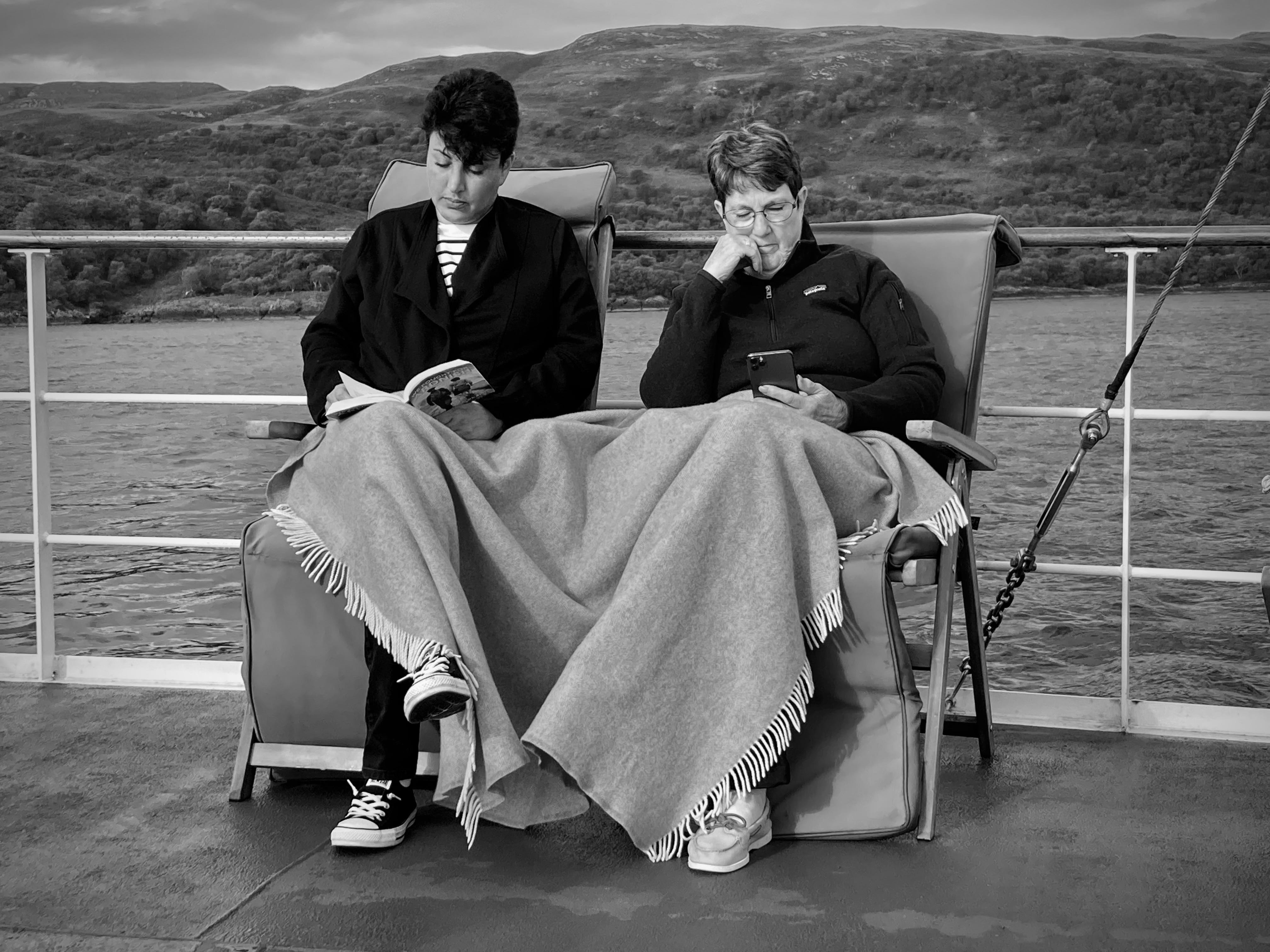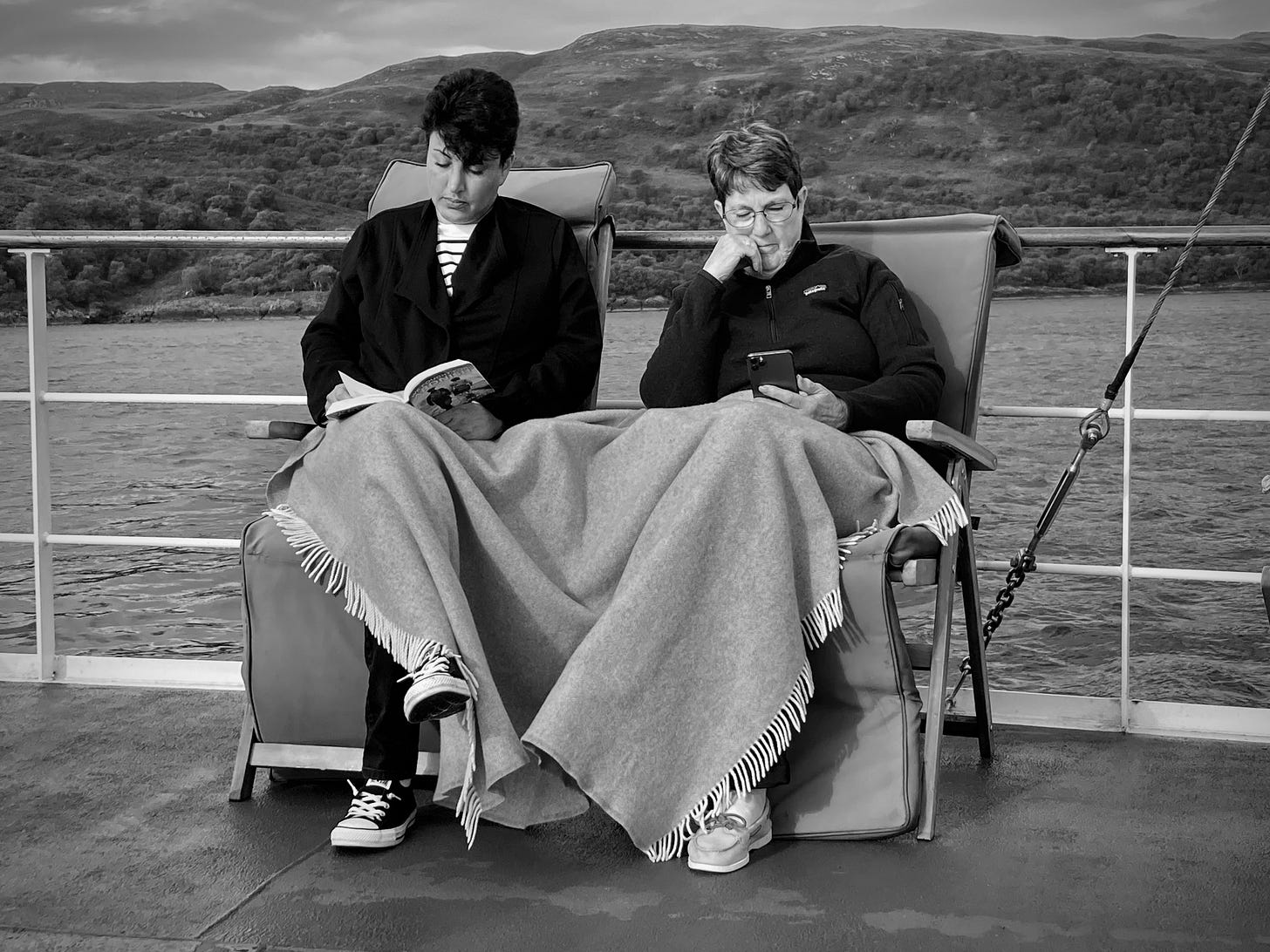 We dined together each evening, made stops along the voyage to motorboat ashore and visit a whisky refinery and other sights. The rest of the time, when not napping in our quarters, we’d read in the ship’s library or climb upstairs to the top deck and take in the breathtaking scenery.