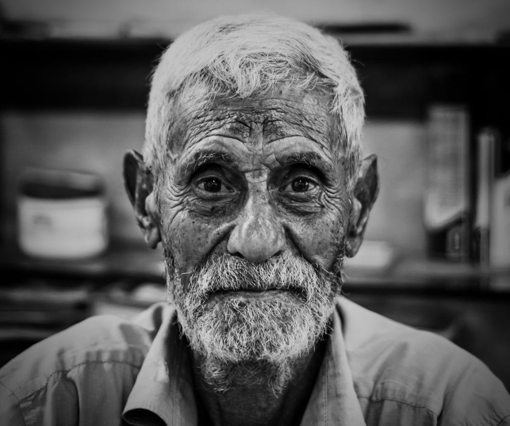 His hair and beard were white. Skin leathery. His eyes were wet and red as if he had been weeping for a very long time.