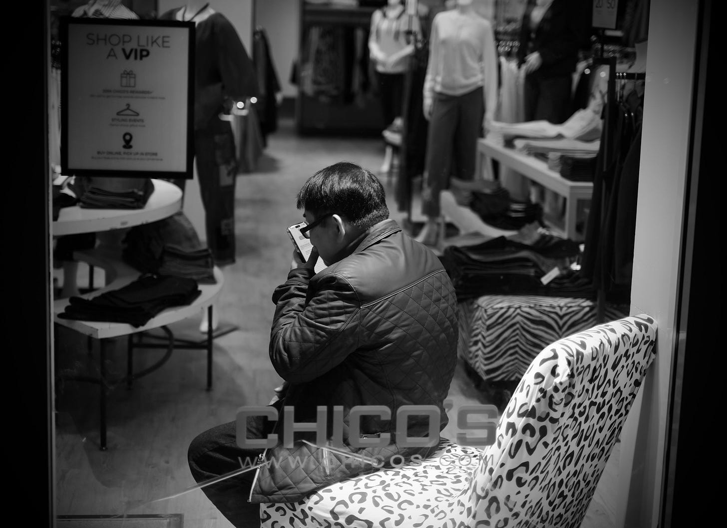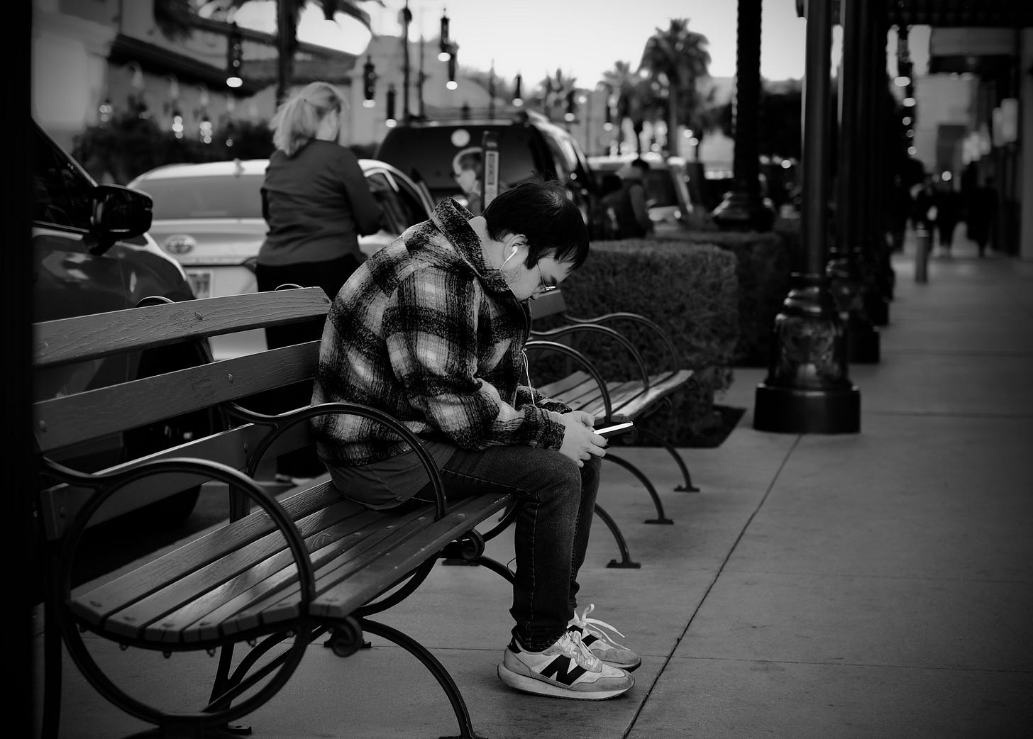 In an outdoor shopping mall I photograph a man on a bench. He checks his phone, perhaps reading emails or listening to music. Then he puts the phone in his pocket and sits there, looking down at his shoes.