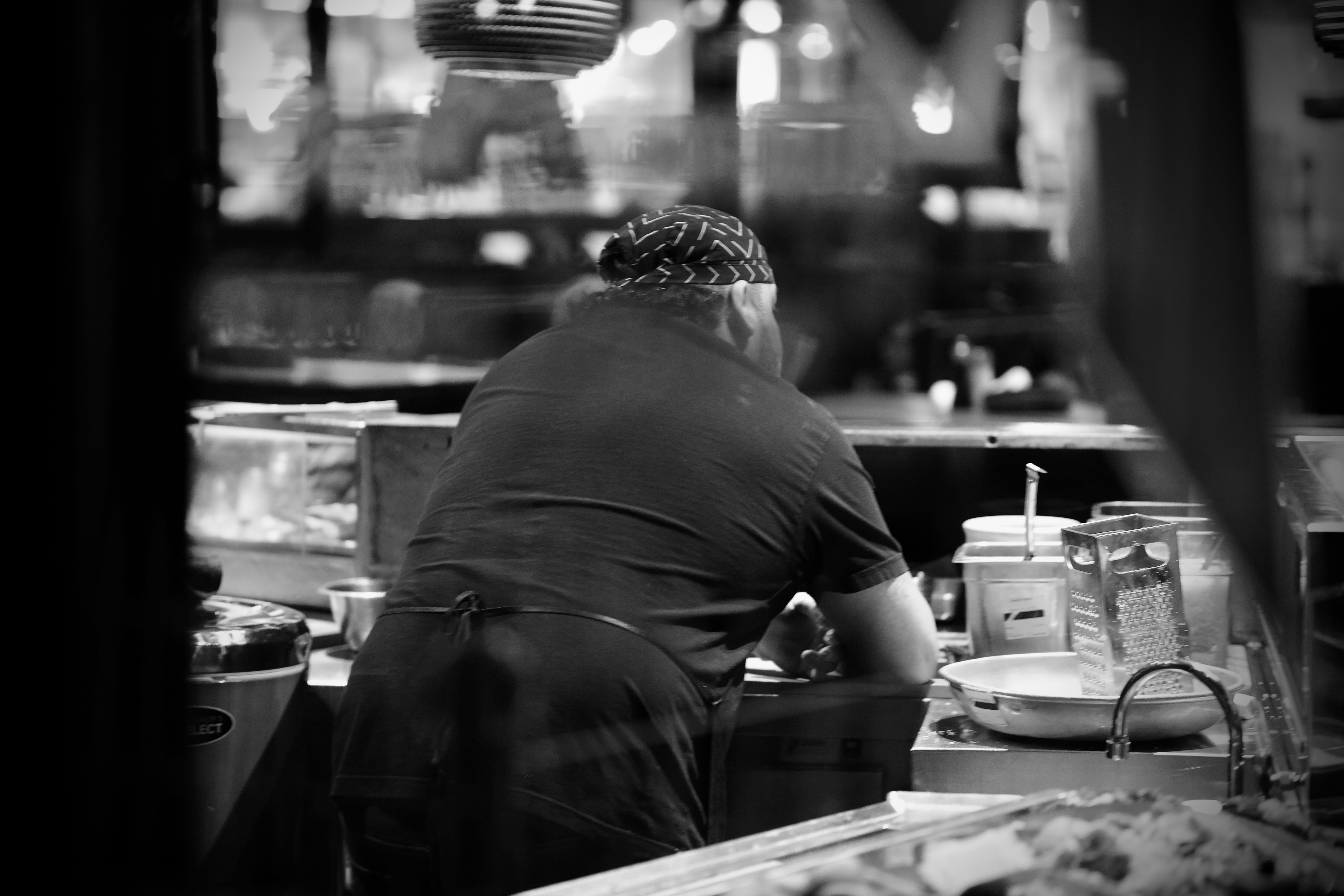 On another day I lift my camera and capture a chef leaning over a kitchen counter.