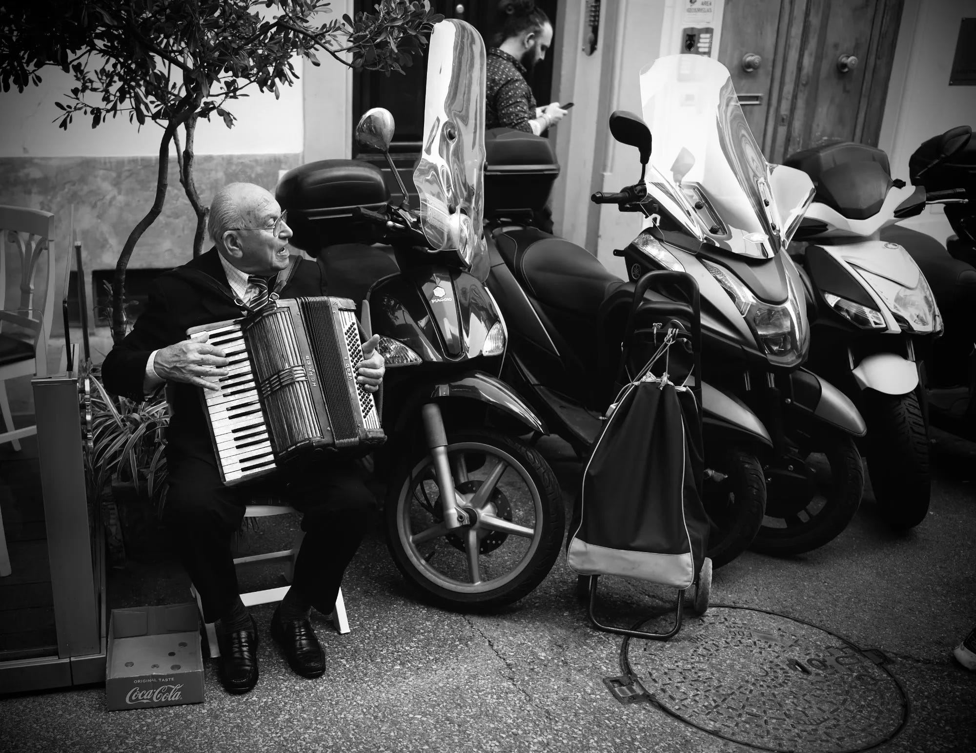 I was walking the sampietrini cobblestones when I came upon him, an aging busker serenading tourists and shopkeepers with a smooth tenor and upbeat melodies. He was dressed smartly in a jacket, crisp white shirt, necktie, and polished shoes. A cardboard Coca-Cola box, nearly empty save a few coins, sat on the ground beside him. Nearby rested a slender handcart and bag for transporting his accordion and folding chair.